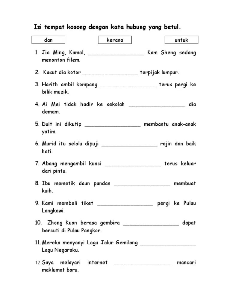 Latihan tatabahasa kata hubung tahun 2 1. Play this game to review other. Nenek mamasak ______ mendengar radio. Isi tempat kosong dengan kata hubung yang betul. Kata hubung tahun 2 kuiz rancangan mainan. Latihantatabahasa garisi katahubung yang betul di dalamayat di bawah. Kata hubung terbahagi kepada tiga, iaitu: Jamil, kamal muthu ( atau, dan ) kamceng . Ali dan abu sedang bersenam di taman. Bina ayat online activity for 10.
